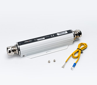 Wasserdichter PoE-Blitzableiter für den Außeneinsatz mit Gigabit-Unterstützung. Sorgt für zuverlässigen Überspannungsschutz bei UG67-Geräten.