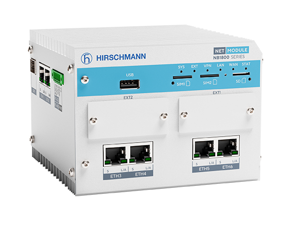 Der NB1810 ist ein leistungsstarker und robuster Mobilfunk-Router, der für den Einsatz im industriellen Umfeld konzipiert ist. Zu seiner Ausstattung gehören ein LTE-A Pro Modul, ein WLAN IEEE 802.11ac (Wi-Fi 5) Modul sowie eine GNSS Empfänger. Dazu ein Gigabit Ethernet Port und ein SFP/GbE combo Port, nutzbar für Glasfaser oder Ethernet, ein USB-Host-Port und eine serielle Schnittstelle mit RS-232- oder RS-485-Modus. Das besondere Highlight ist der ebenfalls integrierte 4-Port Gigabit Ethernet Switch.